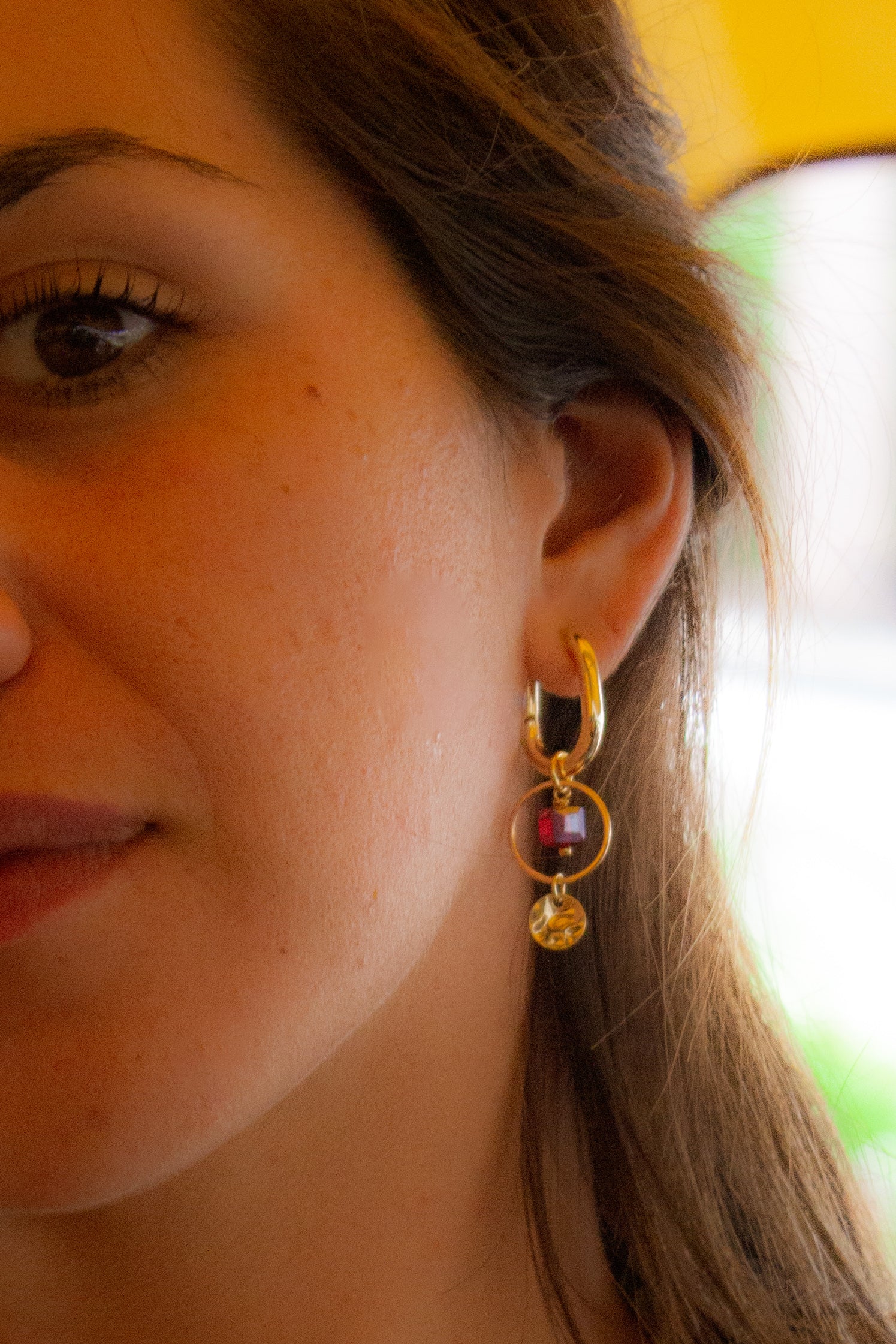 18K gold plated and dark red crystals. Water resistant and hypoallergenic